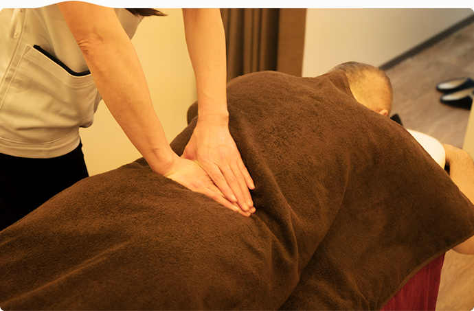まずは、全身を軽擦し、身体の症状を確かめながら、全身をもみほぐしていきます。